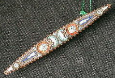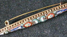 非常に小さな円筒状の色ガラスをモザイクにしてデザインされたブローチです。イタリア製。長さは5cm。状態は良好です。