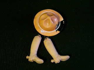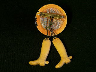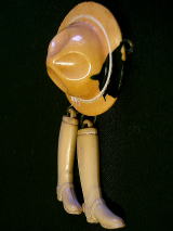 A024 ベークライトブローチ(帽子&ブーツ) SOLD ベークライトのアンティークブローチ。 とても珍しいデザインのブローチです。 帽子に黒い模様が入っています。 帽子直径37mm、高さ15mm クツ長さ30mm ★★★