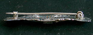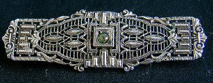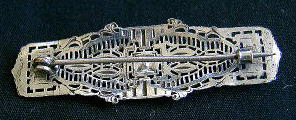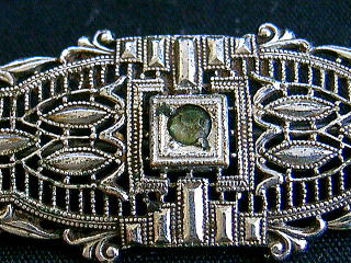 A034 アールデコブローチ SOLD アールデコデザインの緻密な細工のユニークなブローチです。中央の部分に石が入っています。1900年代初頭のものです。使用感はありますがキズや欠けはありません。石と金属の材質はわかりません。 おすすめ! ヨコ50mm、タテ10mm ★★