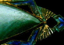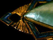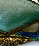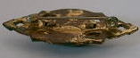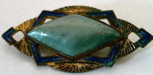 A110 ブローチ(アールデコ) SOLD 1930〜50年頃のブローチ(アメリカ製)です。ゴールドカラーのメタルにコバルトブルーのエナメル彩色が施され、中央に大きなグリーンのパールが付いています。パールが模造品か天然のものかは判りません。キズ、汚れ、破損などなく、状態は良好。40mm×20mm。 ★★★★