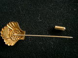 A173 ピンブローチ(HASKELL) SOLD ミリアム・ハスケル(MIRIAM HASKELL)のシェル(貝)形ブローチです。1960〜80年代のものと思われます。金属板をエンボス加工してゴールドトーンに仕上げられています。細部にわたりよく出来ています。ピンの先端にキャップをかぶせる仕組みです。小さくて目立たない大きさですが、さりげないオシャレで差をつけましょう。タテ25mm、長さ75mm。状態はキズ、破損などなく良好です。 ★★★