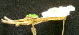 A205 ブローチ(フラワーデザイン) SOLD 可愛い白い野の花のブローチ。ゴールドトーンのメタルベースにプラスチック製の白い花が2輪ついています。葉はエナメル彩色です。1970〜80年頃のアメリカンコスチュームジュエリー。さわやかな感じでさりげないオシャレに合いそうです。タテ35mm、ヨコ57mm、花の直径20mm。状態はキズ、破損などなく良好です。★★★