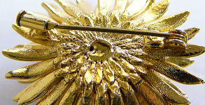 A243 ブローチ(ゴールドフラワー) SOLD 1950〜60年頃と思われるブローチです。ゴールドカラーの立体感あるリアルなフラワーブローチデス。留め金は写真のようにピンの先端を円筒でロックする構造となっています。ちょっとハデめに決めましょう。メーカーなど不明ですがよくできています。直径45mm、厚さ15mm。状態はキズ、汚れ、破損などなく良好です。★★★