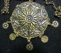 AZ024 ペンダント(純銀メダリオン) SOLD ゴールドトーンに表面処理された純銀(800)製メダル・タイプの丸型ペンダントです。 鋳型で出来ていてずっしりとしています。 模様のデザインは花をあしらったサンバーストで凝ったデザインです。 存在感がありますので派手目のおしゃれにどうぞ。 キズやヨゴレなどなくとても良い状態です。 直径65mm、クサリ長さ600mm。 ★★★★