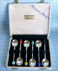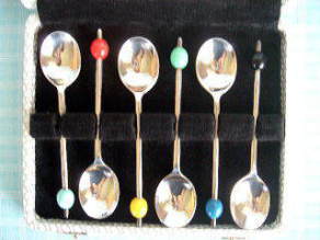 商品番号:C001 商品名:スプーンセット 価格(税込み):10000円 商品の説明: 6色の丸型ビーンズが付いたカラフルなスプーンセット。ニッケルシルバーにシルバーメッキされたEPNS(ニッケルシルバー洋銀)です。イギリスの有名なYEOMAN PLATE のアンティークものです。 状態は良好。