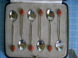 商品番号:C002 商品名:スプーンセット 価格(税込み):SOLD 商品の説明: オレンジっぽいブラウンのコーヒービーンズが付いたスプーンセットです。イギリスの有名なMAPPIN&WEBBのアンティークもの。EPNS(ニッケルシルバー洋銀)です。状態は良好。
