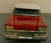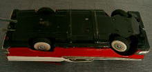 1960年代の日本製(MADE IN JAPAN)のおもちゃブリキ自動車。FORD FAIR LANE500です。電池式リモコンカーで中にMADE IN JAPANと書かれています。電池をいれてボタン操作をすれば、前後に動きます。ナンバープレートにはAV7801 JAPANと書かれています。。全ての部品がブリキで出来ています。サビも殆ど無くとても良い状態です。穴、破損、欠落部品、塗料のハガレなどはありません。タテ270mm、ヨコ110mm、高さ75mm。