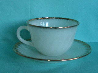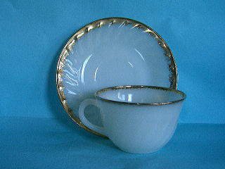H003 ファイヤーキング カップ&ソーサー(ゴールドシェル) SOLD アンカーホッキング社のファイヤーキング。 22KGOLDゴールデントリムのホワイトシェル カップ&ソーサーです。状態良好。 カップ直径100mm、高さ62mm。 ソーサー直径150mm。
