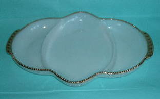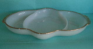 H008 ファイヤーキング シリアルボウル SOLD アンカーホッキング社のファイヤーキング。 22KGOLDゴールデントリムのホワイトシリアルボウルです。金彩のトリムがとてもきれいで申し分ない状態です。1960年前後のものです。ユニークで珍しい形状です。タテ190mm、ヨコ280mm、高さ35mm。