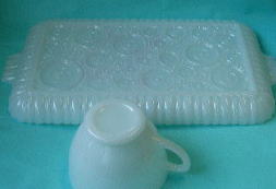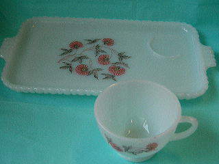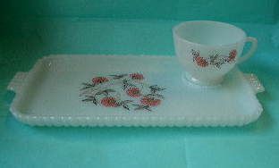 K014 ファイヤーキング スナックセット (フルーレット) SOLD ファイヤーキングのフルーレットと呼ばれるスナックセットです。ミルクガラスのとても可愛いSETです。朝食にどうぞ。カップ直径85mm、高さ60mm。トレーW250mm、D150mm。状態は良好です。
