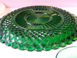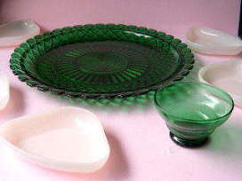 H017 アンカーホッキング レリッシュトレイ (箱入りSET) SOLD アンカーホッキング社のレリッシュトレイです。トレイは大きなダイヤモンドカットのディプレッションガラスでグリーンの鮮やかな色調です。ミルクガラスの小皿が5枚とセンターに小さなボウルが着いています。珍しいお買い得品です。 トレイ直径360mm、ボウル直径100mm×高さ60mm、小皿W115mm×D155mm。 デッドストック品で未使用。