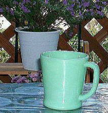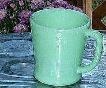 H022 ファイヤーキング ジェードマグ (レストランウエア) SOLD ファイヤーキングの人気アイテムのジェードマグ。面白い形をしていますね。 OVEN FIRE−KING WARE MADE IN USA のプレスマークがあります。 直径80mm、高さ85mm。状態良好。