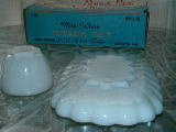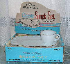 H027 アンカーホッキング スナックセット(箱入り4客SET) SOLD アンカーホッキング社のHeatResistantスナックセット4客箱入りデッドストック品です。箱には8Piece Milk White 22K Gold Edge Snack Set と書かれています。箱はやや傷みが見られますが、中のSETは新品同様です。SETで出るのは珍しいものです。 カップ直径80mm、高さ60mm。トレーW270mm×D170mm。カップとトレーはノーマークです。