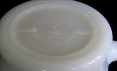 H030 ファイヤーキング ホワイトマグ(レストランウエア) SOLD ファイヤーキングのホワイトミルクガラスのマグ。レストランウエアといわれる厚手のものです。ジェードと並んで人気があります。裏にイカリのマークとOVEN−PROOF MADE IN USA のマークがありますが、このマークは1970年代になってからのものです。直径83mm、高さ85mm。