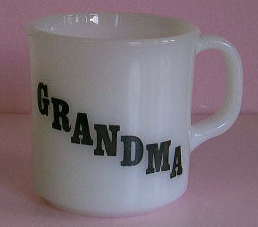 H035 グランドマザー・マグ(ファイヤーキング) SOLD グランドマザー(オバアサン)を讃える文句が書かれています。珍しいマグです。おばあさんへのプレゼントにどうぞ。1970年代のマーク。直径75mm、高さ85mm。 状態は良好です。★★★★