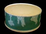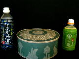 Q024 ブリキ缶(ウエッジウッド風) SOLD ウエッジウッドのジャスパーウエアのように立体的にエンボス加工されたビニールが缶の全体に貼られたブリキ缶。陶器製のような凝った装飾でとてもよく出来ていて重厚な感じがします。蓋は分厚い2重構造になっていて、裏にWARD BAKING Co.NEW YORKと刻印が入っています。缶の底部に所々サビが見られますが穴や破損はありません。クッキーのようなものの容器だったのではないかと思われます。直径207mm、高さ90mm。 ★★★