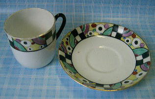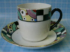 商品番号:S006 商品名:カップ&ソーサー 価格(税込み):SOLD FOLEYの手描きデミタスカップです。アールデコの 模様がしゃれていますね。1919年のものです。 カップのサイズは直径60mm×高さ60mm。 お皿のサイズは直径100mm。 状態は良好です。