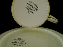 S037 カップ&ソーサー(FOLEY) SOLD FOLEYのシルエット・カップ&ソーサー(デミタス)です。英国紳士淑女の姿が風景をバックに影絵となっています。FOLEY CHINA LAWLEYS ENGLAND と書かれています。1920〜40年頃のものと思われます。状態は良好。使用感はありません。カップ直径55mm、高さ60mm。ソーサー直径117mm。 ★★★★