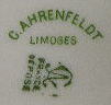フランス・リモージュ・アーレンフェルド(AHRENFELDT)のカップ&ソーサーです。カップの側面には凸状の無地装飾と部分的金彩があり、バラの花柄とよくマッチした、リモージュらしい一品です。軽くて丈夫な高級磁器です。裏にC.AHRENFELDT LIMOGESと書かれています。CとAの組み合わさったC.J.AHRENFELDTの窯マークが見られます。1894〜1930年のものです。使用感もほとんどなく良い状態です。カップ 直径97mm、高さ50mm、ソーサー直径147mm。