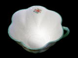 イギリスのシェリー窯のカップ&ソーサー・ケーキ皿のトリオ。ディンティと呼ばれるシェイプ(Ro.272101)でNo.13426のROSEBUD(バラのつぼみ)と呼ばれるパターンです。裏にShelley ENGLAND と書かれたマークがあります。Daintyとは優雅なという意味で、カップの形が花びらのようです。このディンティシェイプはクイーンアンよりも古く、ワイルマンの時代にローランド・モリスという人がデザインしたもので、当時は大変人気がありました。使用感はありません。とても良い状態です。カップ直径90mm、高さ60mm。ソーサー直径140mm、ケーキ皿直径150mm。★★★★