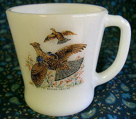 GM013 バード・マグ(ファイヤーキング) SOLD 1960年代のFIRE KING耐熱ガラスのマグです。 雷鳥(GROUSE)の絵です。 バードウオッチャーにお奨め!レアかも。 直径82mm、高さ85mm。 ★★★★